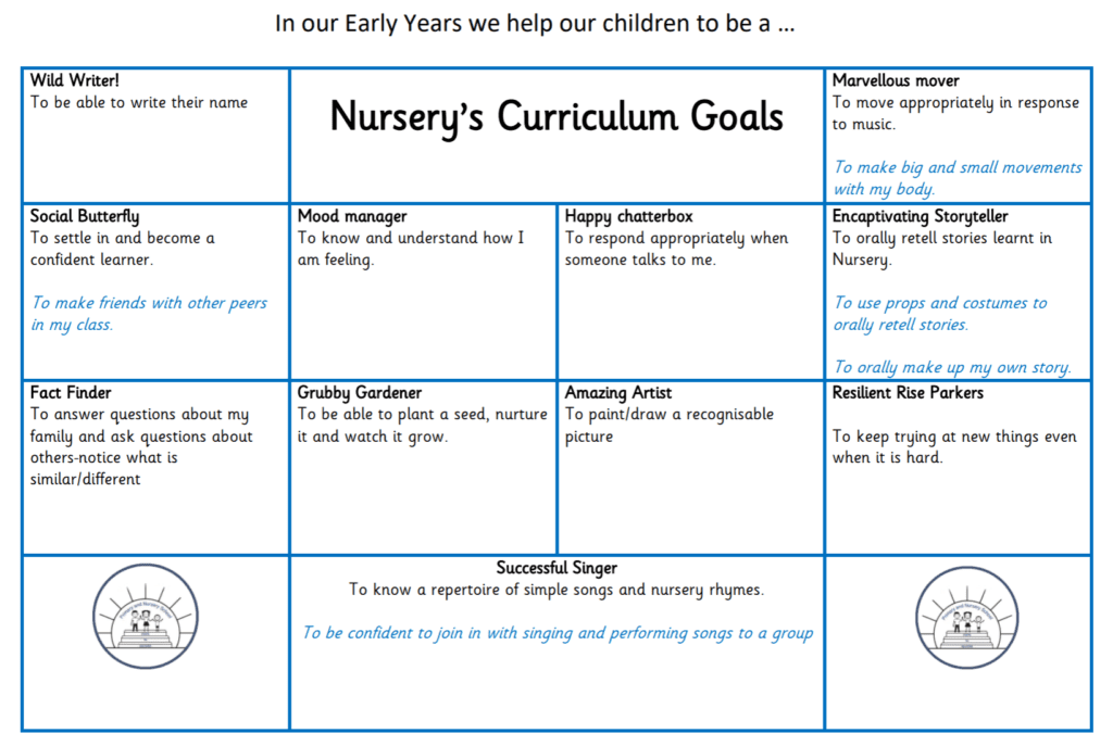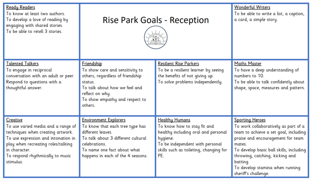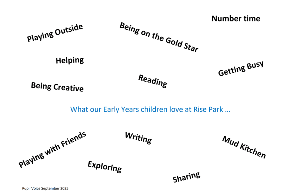 The EYFS curriculum at Rise Park Primary and Nursery, is designed to recognise children’s prior learning both from previous settings and their experiences at home. We know that our children enter the Nursery and Reception classes with varied life experiences and we aim to plan teaching and learning opportunities accordingly to address this. Every child is recognised as a unique individual and we pride ourselves on celebrating and welcoming differences within our school community. We know that young children need positive relationships with adults who are warm, enthusiastic and respect what children bring and build upon. We understand the importance of the teaching and acquisition of basic skills, knowledge, concepts and values and provide rich and memorable opportunities to engage learners. We are ambitious for our children. We believe that our first experiences of school should be happy and positive, enabling all to develop a lifelong love of learning.